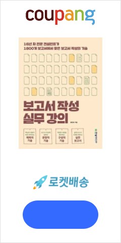 ![[한빛미디어]보고서 작성 실무 강의 - 16년 차 전문 컨설턴트가 1800개 보고서에서 찾은 보고서 작성의 기술, 한빛미디어](https://static.coupangcdn.com/image/affiliate/banner/357bdcdb85c7d5d33a58d73d04db7799@2x.jpg)